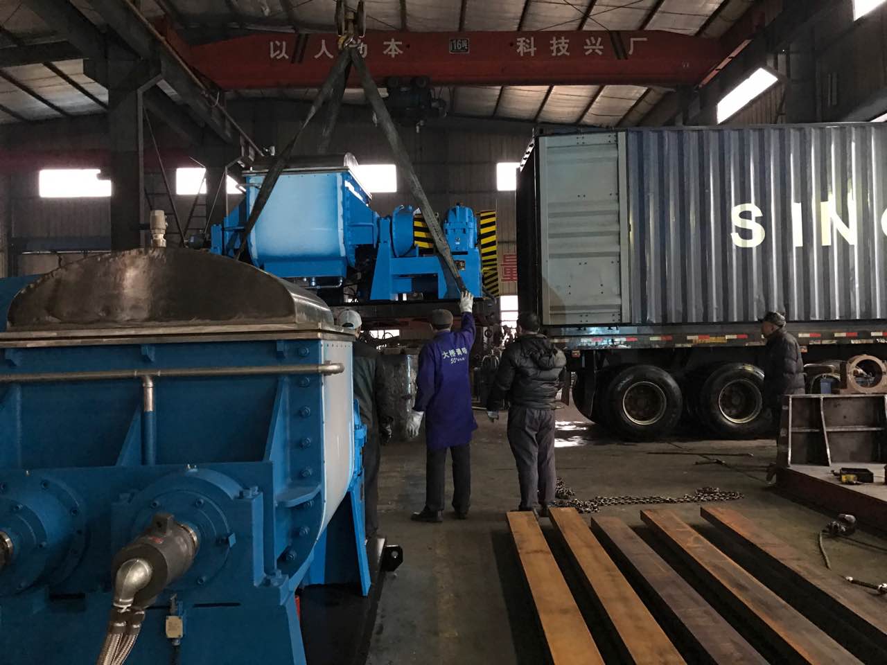 外商訂購的真空捏合機,裝箱現(xiàn)場。該機器結構新穎,液壓式開蓋,液壓式翻轉缸體出料,攪拌軸可以通冷熱介質。缸體夾套可以通冷熱介質。該機技術含量高,攪拌軸形狀特殊設計,可以物料得到充分的混合攪拌,并可伴隨化學反應。效率高,外商非常滿意